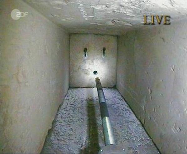 К великому разочарованию исследователей, видеотрансляция сумела показать лишь то, что за каменной дверцей нет ничего, кроме другого камня – на расстоянии сантиметров двадцати от первого… Попутно тогда же было установлено, что вторая шахта из Камеры царицы поднимается в северном направлении на точно такую же высоту, аналогично упираясь в такую же каменную заслонку с двумя металлическими шпильками.