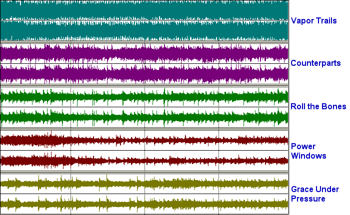 Альбом 2002 года Vapor Trails, по всеобщему признанию поклонников, из-за такого сверхсжатия слушать оказалось просто невыносимо. И хотя сами песни и общий музыкальный материал вполне хороши, запись была загублена буквально на всех этапах производства, так что переиздать альбом с новым ремастерингом оказалось в принципе невозможно. Только если отыграть и записать все заново.
