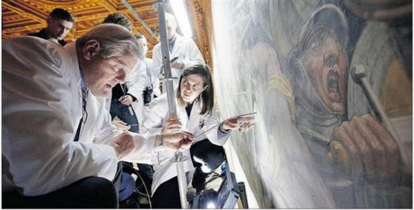 Объясняя суть проделанной ими работы, ученые во главе с профессором Маурицио Серачини (Maurizio Seracini) рассказали вот что. Благодаря применению миниатюрных щупов и видеозондов, их исследовательский хайтек-проект позволил ныне обнаружить убедительные свидетельства того, что знаменитая фреска Леонардо да Винчи, утраченная еще пять веков тому назад, вероятно, все еще существует – за скрывающей ее фальшь-стеной непосредственно в том самом зале, где проходит пресс-конференция.