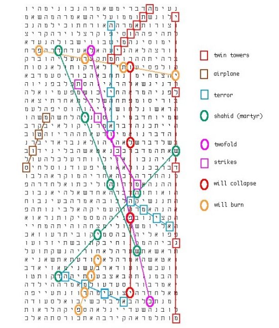 Ну всё что угодно, короче говоря. А отыскиваются эти предсказания так. Все 304 805 букв на иврите, составляющие Тору, загнаны в компьютер в виде одной большой строки. Дроснин (секуляризованный американский еврей, ради этого дела выучивший иврит) задаёт машине вопрос, к примеру, про Саддама Хуссейна.