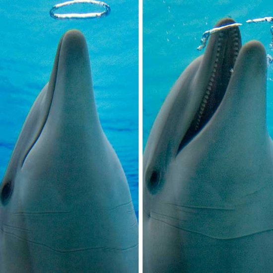 Новое кольцо дельфин начинает «подталкивать» носом, играя с ним секунд 10. Затем останавливается, оглядывает вращающееся кольцо напоследок и перекусывает его, в результате чего стайка пузырьков устремляется к поверхности воды. После этого следует небольшая пауза и, словно поразмышляв, дельфин создает новое кольцо…