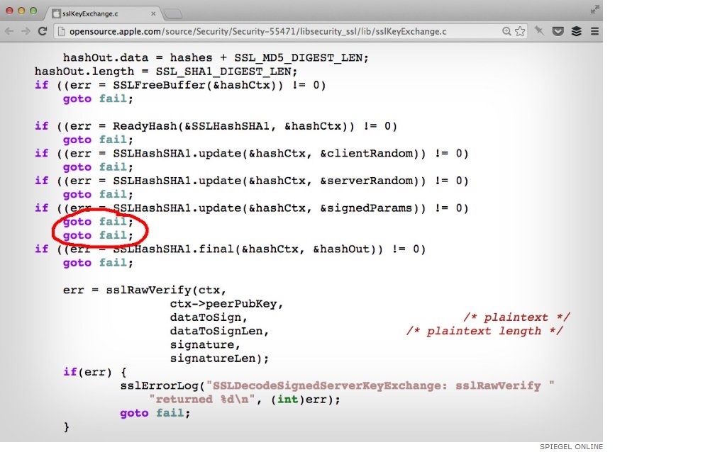 Как и все прочее, что связано с Айфонами Apple, эта критическая дыра в криптографии, объявленная для iOS 7 вечером в пятницу, 21 февраля, тоже оказалась «образцом простоты и элегантности конструкции»: всего лишь единственный невинный переход “goto” в одном из модулей кода Apple для процедуры аутентификации по несчастливой случайности обходит всю остальную часть критично важного процесса безопасности…