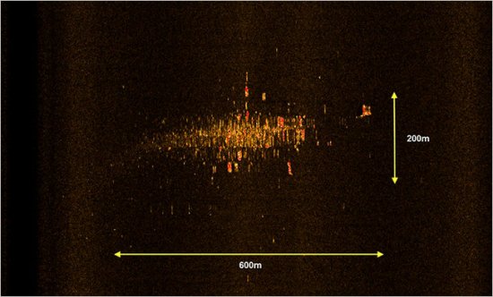 Иначе можно сказать, что искомая вещь обычно выглядит как отчетливое скопление ярких точек в той области, где ничего особенного отражаться не должно. По сути дела, как поясняет Перселл, исследователей интересует множество маленьких ярких точек на достаточно большой площади морского дна – конкретно в их условиях на 24-дюймовом мониторе отображается полоса дна шириной 1400 метров.
