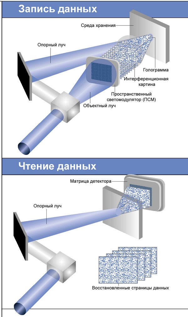 Вся эта информация целой страницей переносится в предметном луче далее, к светочувствительной среде (кристалл ниобата лития или полимер). Второй луч, именуемый опорным лучом, проходит по собственной «обходной» траектории и также падает на записывающий кристалл. В месте схождения двух лучей создается интерференционная картина, которая и записывается в устройство хранения как голограмма страницы данных. Небольшими изменениями угла наклона опорного луча или изменением длины волны лазера в тот же кристалл можно записывать множество других страниц данных.