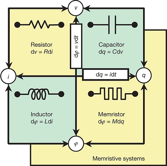 Согласно логике Чуа, четыре базовых величины, характеризующие состояния электросхемы (заряд, ток, напряжение, магнитный поток), могут быть соотнесены друг с другом шестью возможными способами. Для двух из этих 6 соотношений имеются базовые физические законы, а еще для трех существуют общеизвестные элементы электросхем: резистор, конденсатор, индуктивность. При этом одна позиция – соотносящая заряд и магнитный поток – оставалась в красивой-симметричной картине ничем не занятой. Поэтому Чуа, исходя из соображений математической эстетики, предложил на вакантное место свой «мемристор».