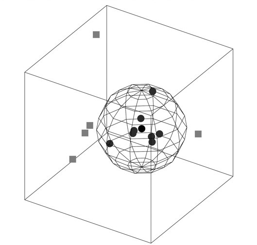 Графическое отображение этих результатов можно видеть на упрощенной трехмерной схеме «взаимных расстояний», где плотно сгруппированные кружочки означают 8 работ Брейгеля, а удаленные от них квадратики — 5 имитаций (черный кружок обозначает центр сферы, ограничивающей область «аутентичных картин»).