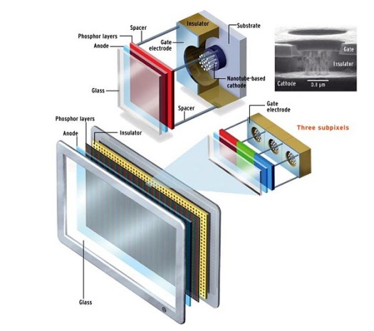 Сегодня карбоновые нанотрубки, благодаря их редкостным физическим свойствам, положены в основу многих новых технологий в микроэлектронике – от запоминающих устройств и транзисторов нового поколения до межсоединений в сверхплотно упакованных чипах. Новые же экраны на основе феномена автоэлектронной эмиссии и матрицы из катодов-нанотрубок сулят объединить в себе лучшие черты всех популярных на сегодня дисплеев – яркость красок и ширину обзора катодно-лучевых трубок при отсутствии свойственных им деформаций изображения по краям, плоскую панель как у жидкокристаллических и плазменных решений, и при этом очень небольшое (десятки ватт) потребление энергии.
