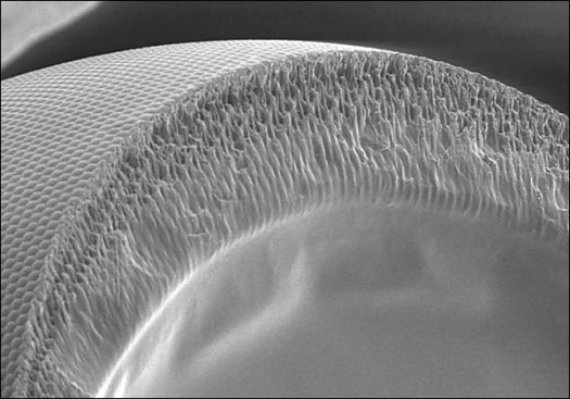 Для изготовления фасеточного микроглаза ученые придумали совершенно новую технологию, во многих своих чертах воспроизводяющую естественные процессы самоорганизации в природе. Сначала из эластичного полимера изготовляется тонкий плоский лист, структура которого напоминает микроскопические пчелиные соты шестиугольной формы. Этот лист прикладывается к миниатюрному концу вакуумного шланга, кратковременное всасывание которого придает соответствующему участку куполообразную форму.