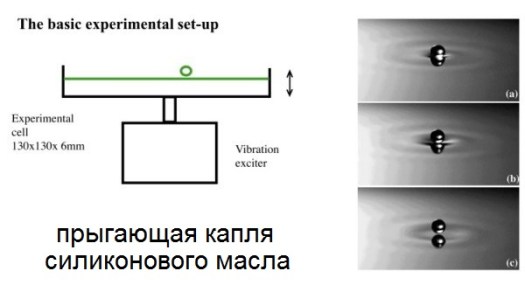 Оказалось, что капля масла, прыгающая на вибрирующей поверхности жидкости, воспроизводит множество феноменов, прежде считавшихся присущими лишь исключительно физике квантовой. В частности, были продемонстрированы наглядные классические аналоги и для особо загадочных квантовых феноменов: интерференция одной частицы на двух щелях, туннельный эффект прохода через потенциальный барьер, квантование орбит и так далее…