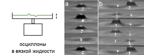 Главная же общая черта экспериментов заключается в том, что при определенном наборе параметров в вибрирующей среде возникают осциллоны. То есть на редкость стабильные стоячие волны, осциллирующие между двумя существенно разными состояниями – кратера и пика для гранулята, холма и ямы для жидкости. И что самое любопытное, разные фазы колебаний осциллонов ведут себя в точности как электрические заряды: одинаковые фазы взаимно отталкиваются, противоположные фазы взаимно притягиваются…