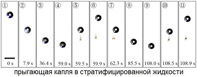 (2) О чем в заключении статьи сказано мимоходом и вскользь. Описанная исследователями система может быть легко обобщена на случаи других жидкостей – при условии, что имеется вертикально стратифицированная жидкость, порождающая достаточно сильный эффект Марангони на поверхности капли. Этот вывод подтверждается наблюдениями ученых за каплей силиконового масла, которая помещалась в ту же самую стратифицированную жидкость и демонстрировала аналогичное прыгающее поведение. В настоящее время авторы заняты исследованиями того, каким образом на прыгающее поведение капли влияют другие параметры системы…