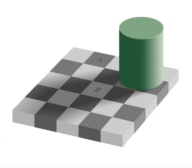 При взгляде на эту картинку практически любой человек с нормальным зрением и нормальными мозгами (не ведающими заранее о подвохе) вполне уверенно заявит, что клетка А совершенно определенно темнее, чем клетка B. И окажется в корне неправ… Ибо на самом деле клетки A и B имеют в точности один и тот же оттенок серого цвета. Мощную иллюзию разницы создают специфический контекст «трехмерной» картинки на плоскости и особенности работы нашего мозга, автоматически компенсирующего худшую видимость объектов, находящихся в тени, их искусственным «подсвечиванием» или добавлением контрастности.