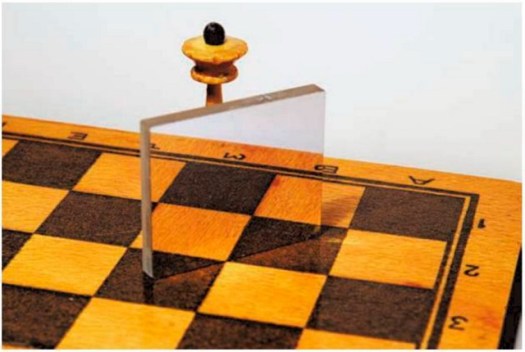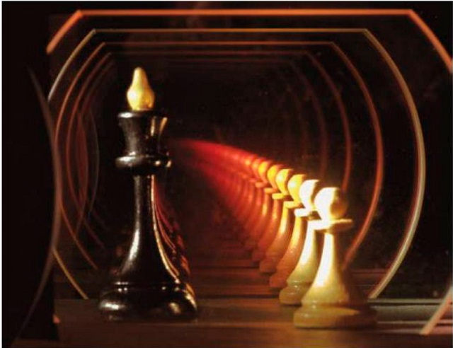 Еще один близко родственный сюжет – это то, как выглядит реальность шахматных фигур, находящихся между двумя зеркалами. Один и тот же объект повторяется многократно в своих отражениях, уходящих все дальше и дальше в бесконечность…