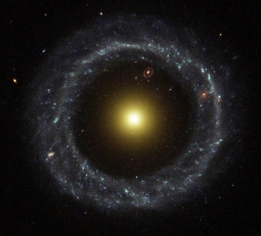Ну а на картинке последней – для глубокомысленного сопоставления – дана фотография знаменитой в своем роде галактики PGC 54559, иначе именуемой «объект Хога» и имеющей вид практически идеального вихревого кольца. Теоретическая наука пока что не знает наверняка, каким образом могла образоваться галактика столь замечательной формы. Практическая же наблюдательная астрономия, с другой стороны, уже довольно давно установила, что внутри кольца можно увидеть еще одну далекую галактику точно такой же кольцеобразной формы – по циферблату в районе 1 часа.