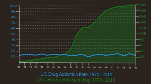 О подробностях появления и источниках данных для этой интересной картины можно узнать в тексте «История города Глупова» , здесь же достаточно обойтись лишь поясняющими суть комментариями. Синяя линия на графике отражает процентную долю наркозависимых людей среди общей массы населения страны, а главная особенность этой доли в том, что на протяжении 40 лет «войны с наркотиками» (1970-2010) она стабильно оставалась примерно одной и той же на уровне около 1,3%. При этом вторая – зеленая – линия, из год в год взмывающая все выше и выше, отображает многомиллиардные затраты бюджетных средств государства на борьбу с наркотической напастью…