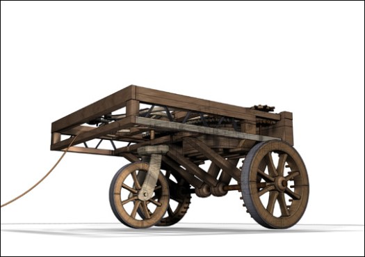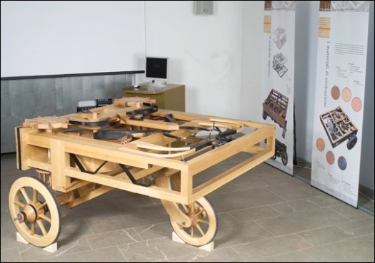 Как известно, в бумагах и записных книжках итальянского гения – в частности, в наиболее крупном собрании, известном сегодня как Codex Atlanticus – имеются схемы и чертежи самых разнообразных устройств, далеко обогнавших свое время: аэроплан, парашют, вертолет, подводная лодка, танк, паровая машина. Созданная ныне самодвижущаяся повозка построена по эскизу из «Атлантического кодекса» (лист 812r), набросанному Леонардо в 1478 году, когда ему было 24 года.