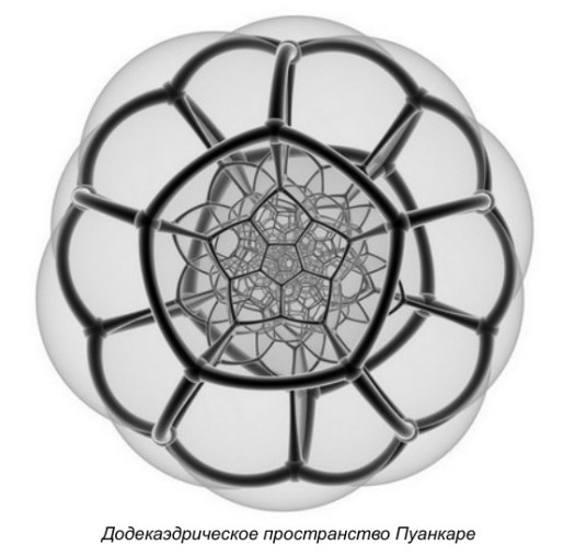 Поначалу эта специфически устроенная сфера воспринималась в науке как сугубо абстрактная математическая причуда, не имеющая никакого отношения к реальности. Однако спустя некоторое время два других математика, Вебер и Зейферт, продемонстрировали, что в действительности именно такую сферу гомологий можно получить из вполне конкретного объекта – правильного многогранника додекаэдра, прекрасно и давно известного в геометрии ещё со времён Пифагора и Платона. Причём известного древним грекам, что существенно, в весьма особенной роли «каркаса» для сферы космоса. Главная же особенность додекаэдра в том, что он состоит из двенадцати граней в форме правильных пятиугольников.