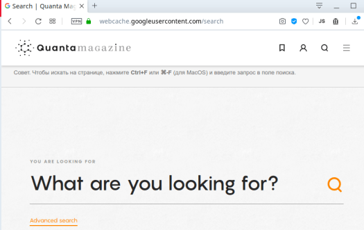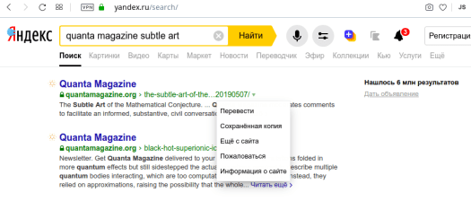 Тот же Яндекс, к примеру, легко и сразу находит интересующую вас публикацию на сайте Quanta Magazine, попутно сообщая, что для этой же статьи имеется сохранённая копия в кэшах поисковой системы.