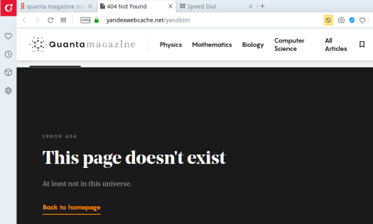 Ибо за прошедший год ситуация с выпиливанием статей Quanta Magаzine во внешних архивах осталась не просто прежней, но и кое в чём даже ухудшилась. Потому что в общую картину блокировок добавились теперь и недоступные копии из кэшей российской поисковой системы Yandex…