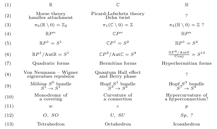 Для всех, кто хотя бы в общих чертах представляет себе структуру математических знаний, невозможно не заметить, что в таблице «полиматематического гербария» Арнольда явно недостаёт ещё одной колонки. Ибо в действительности числовые пространства непрерывных множеств описываются с опорой не на три, а на четыре базовые структуры, тесно связанные друг с другом: действительные числа, комплексные числа, кватернионы и октонионы.