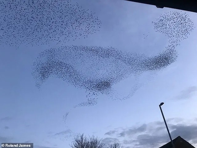 На редкость удачный фотоснимок, запечатлевший поразительную картину мурмурации огромной стаи скворцов в форме гигантской птицы, был сделан буквально только что, в первых числах марта на одном из озер Ирландии.