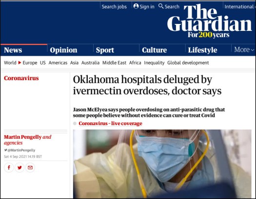 Oklahoma hospitals deluged by ivermectin overdoses, doctor says. (The Guardian, 4 Sep 2021)