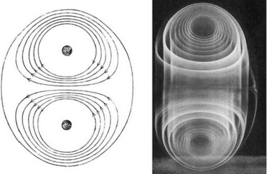 На иллюстрации: Квази-частица с продольно раздвоенной модой, состоящая из двух одинаковых вихрей, известная как «овал Кельвина» и как плоская волна-солитон, идентичная вихревому кольцу в разрезе.