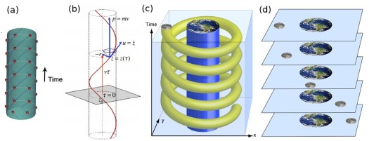 Элементы структуры тахионного кристалла – как фибры кос и слои снимков во времени: (a) кристалл времени Вильчека для ансамбля частиц, (b) траектория одной частицы во времени, согласно уравнению Дирака и алгебре Клиффорда, (c) траектория во времени для пары сложных объектов, (d) снимки состояний той же системы в слоях тахионного кристалла.