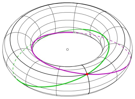 Окружности Вилларсо, обозначенные зеленым и розовым, являются элементами двух торов Клиффорда-Хопфа. В терминах модели Фейнмана это два направления траекторий частицы в зависимости от её спиральности.