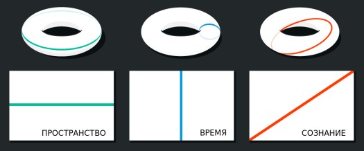 Концепция абсолютного отсчёта времени в этой схеме означает дискретные и единые для всего пространства такты встряхивания для мембраны пространства нашего мира. А концепция абсолютной одновременности, соответственно, означает сдвиг всей мембраны по оcи времени на торе – в каждом такте на один шаг – от дыры белой к дыре чёрной.
