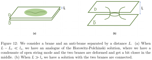 У авторов статьи на этой иллюстрации поясняется суть гладкого перехода от (a) решения Хоровица-Полчински для физики открытой струны в условиях очень близко сошедшихся мембран, именуемых брана и анти-брана, к решению (b) в условиях мембран разошедшихся, но теперь соединённых открытыми струнами – с концами на бране и антибране.
