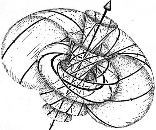 На языке топологии и геометрии эта конфигурация известна как нетривиальная фибрация Хопфа. На языке современной физики, где каждому интересному объекту со свойствами квазичастицы принято давать собственное имя, то же самое именуют хопфион. Ну а для нас здесь наиболее важен тот неоспоримый факт, что в физике жидкостей именно такую форму имеют вихревые кольца.