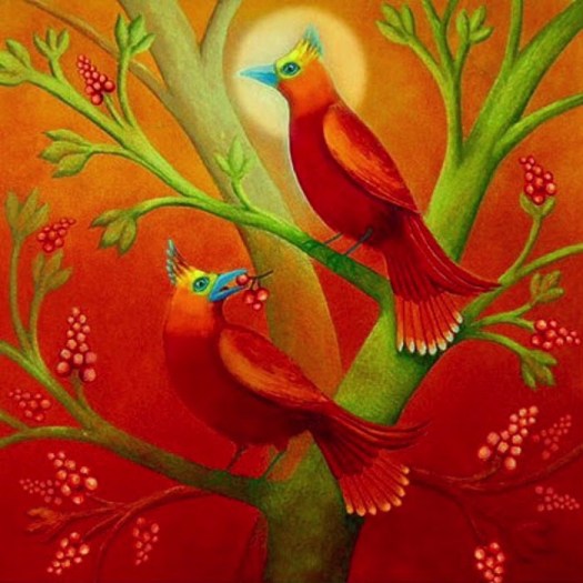 Одна из них поедает сладкую ягоду, другая лишь наблюдает, еды не касаясь.И там, где эти чудесные птицы воспевают свою вечную жизнь,