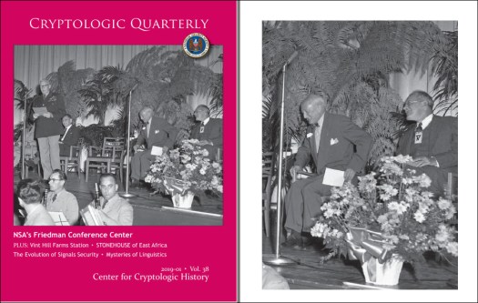 Спустя ещё полтора года, в начале 2019, очередной открытый выпуск Cryptologic Quarterly [3] был оформлен на обложке большой фотографией, запечатлевшей торжественную церемонию в конференц-зале первой штаб-квартиры АНБ в Арлингтоне. Подпись к фотографии поясняет, что там происходит: