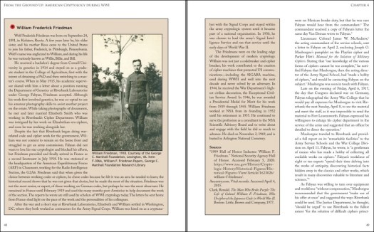 Более того, существенной ревизии подвергнуты не только роль и место Фридмана, но и важные обстоятельства истории, сопровождавшие появление этого человека в сферах государственной криптографии. Поскольку в новой книге Смут почти (но не) всем персонажам, оказавшим личное влияние на становление военной криптологии США, посвящены специальные врезки, есть такая врезка и для Уильяма Ф. Фридмана. И если читать этот текст достаточно внимательно, то обнаруживается нечто действительно примечательное.