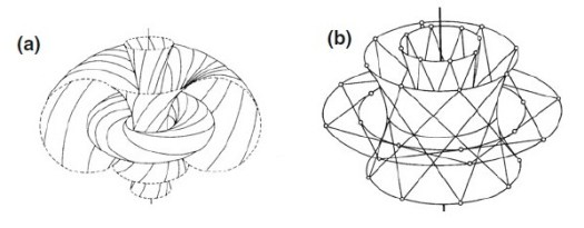 Дабы пояснить данный факт более наглядно, полезно в очередной раз обратиться к главе Формы в Путеводителе ТЗО и привлечь оттуда два математически эквивалентных изображения для фибрации Хопфа: на основе геометрий тора и гиперболоида.
