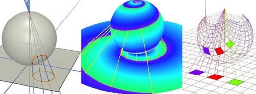 Стереографическая проекция известна в географии и геометрии как один из хороших способов отобразить искривлённую поверхность шара – то есть пространство 2-мерной сферы – на поверхность плоской карты. Любой из способов проекции неизбежно вносит в картину те или иные искажения, однако стереография хороша тем, что окружности переводит в окружности, а при отображении других фигур сохраняет величину углов между прямыми. То есть не меняет особенности формы. Такого рода преобразование в математике именуется конформным.