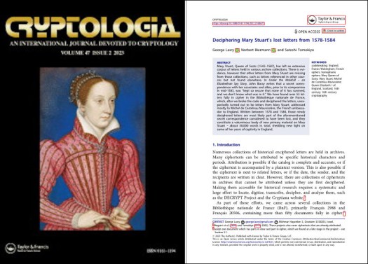 [o5] George Lasry, Norbert Biermann & Satoshi Tomokiyo. Deciphering Mary Stuart’s lost letters from 1578-1584. Cryptologia, Volume 47, 2023 — Issue 2, pages 101-202 Published online: 07 Feb 2023. DOI: 10.1080/01611194.2022.2160677