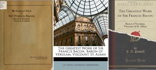 Учитывая все эти факты, вполне естественно поинтересоваться (коль скоро историки АНБ очевидно имеют склонность к умолчаниям), а не публиковались ли и в Ривербэнке собственные книги Джона Пауэлла? Сравнительно недолгие поиски информации в интернете показывают, что да, действительно, были такие книги. Точнее говоря, по крайней мере одна такая книга выходила точно. В 1916 году, под названием «Величайший труд сэра Фрэнсиса Бэкона» [o2].