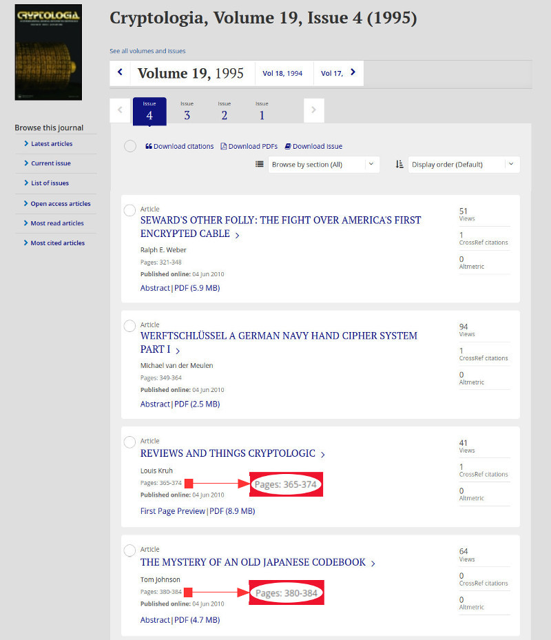 У издания CRYPTOLOGIA, самого почтенного журнала об истории криптографии, в интернете имеется вполне содержательный сайт с цифровым архивом всех номеров и публикаций. Точнее, почти всех. Потому что когда вы зайдёте на страницу Выпуска 4 за 1995 год, где публиковалось нужное нам письмо Луи Кру на страницах 377-379, то обнаруживается, что именно эти страницы почему-то не оцифрованы. То есть ни в оглавлении выпуска, ни в интернете их просто нет…