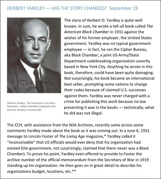 [o7] History Today: Herbert Yardley — Has The Story Changed? NSA Center for Cryptologic History, 2018 September 28