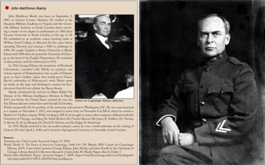 Но во всех этих случаях, что примечательно, упоминания темы шифров в текстах Шекспира так или иначе связаны с именем Джона Мэтьюза Мэнли, видного профессора-филолога, а в годы войны ещё и шпиона-криптографа, разработавшего некую «систему дешифрования, которая опровергла теорию о Бэконе как Шекспире».