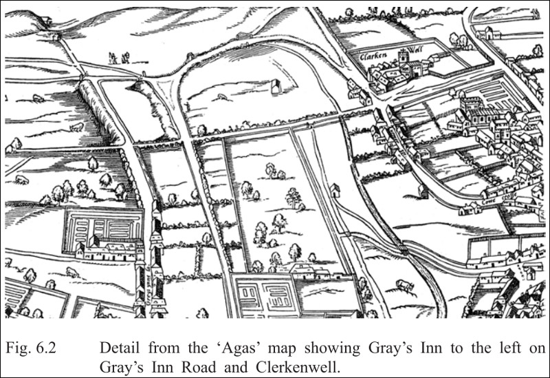 Фрагмент карты Лондона эпохи Тюдоров. В левом нижнем углу Грейс-Инн, в правом верхнем углу монастырь Кларкенуэлл.