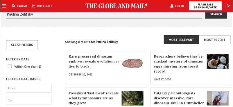 Тот же самый – нулевой – результат выдаётся на сайте журнала National Geographic. А на сайте ведущей канадской газеты Globe and Mail, где об открытии Полины Зелицкой и ADC в прежние времена писали неоднократно, придумали нечто более оригинальное. Теперь на запрос об этой даме выдаётся из архивов восемь статей про даму совсем другую, палеонтолога Дарлу Зеленицки (Prof. Darla Zelenitsky, видный научный авторитет по динозаврам).