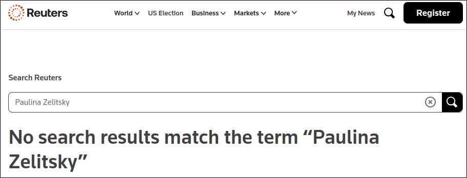 Если вы ныне зайдёте на сайт новостной службы Reuters и запросите информацию о Полине Зелицкой, то вообще никаких публикаций в архивах на этот счёт там не обнаруживается. Ноль.