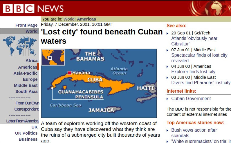 К концу же 2001 решение об огласке, наконец, было принято – и 6-7 декабря ведущие в мире новостные агентства и СМИ, начиная с Reuters и BBC, опубликовали интереснейшее известие под таким примерно заголовком: «На дне океана у берегов Кубы обнаружен ‘Затерянный Город’». [o4]