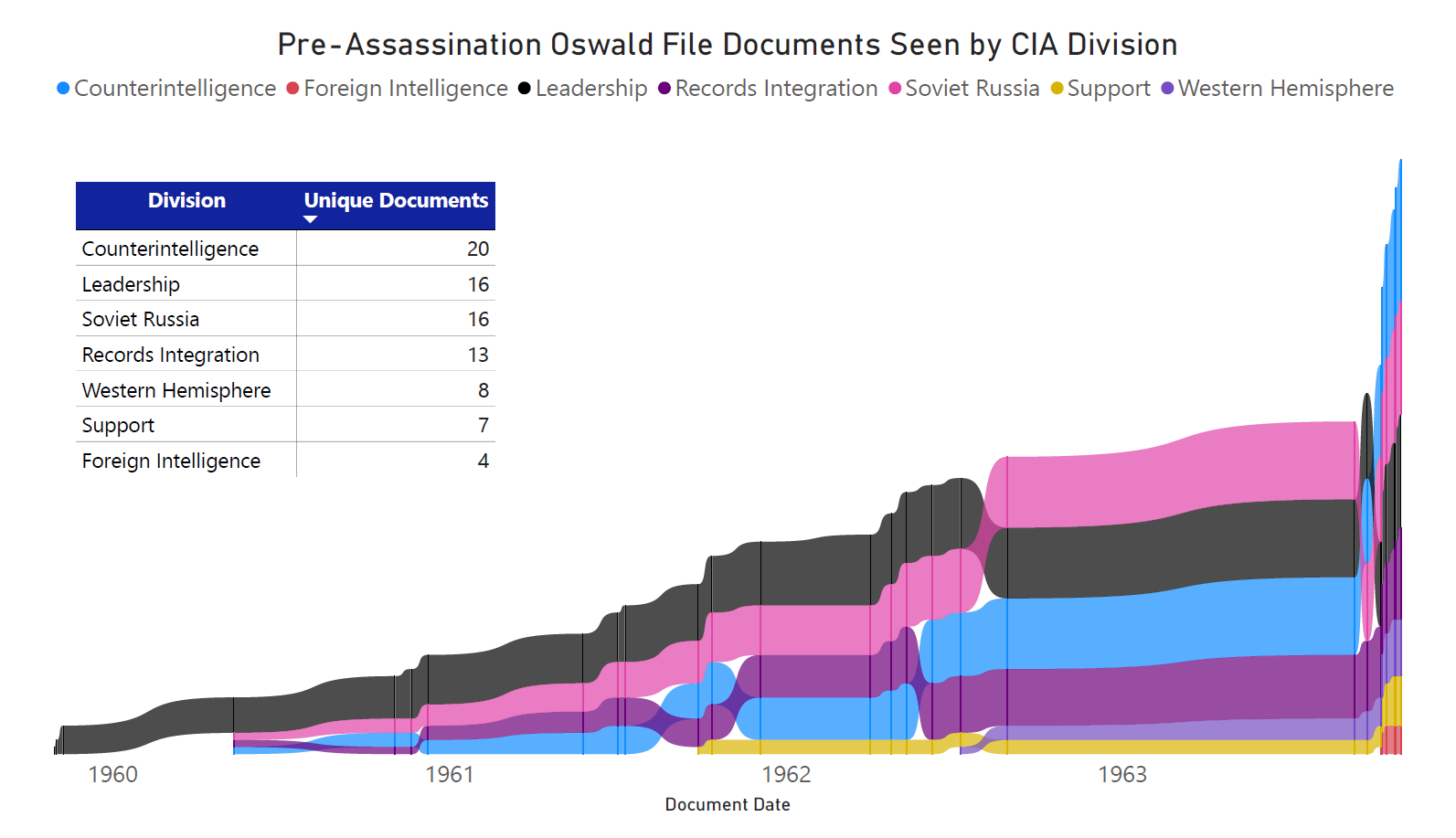На графике, который сделал профессиональный аналитик данных John Reid, отображена динамика роста для количества тех документов, касающихся Ли Харви Освальда, которые проходили в шести подразделениях ЦРУ до убийства президента Кеннеди, за период с ноября 1959 до ноября 1963 (Источник: JFKfacts)
