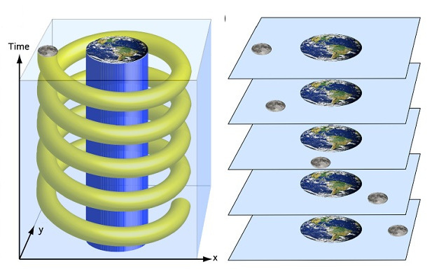 …Ньютоновское время объединяет события в разных местах, образуя единый глобальный момент времени. Каждый такой момент является “срезом одновременности” в классическом пространстве-времени. Теория относительности, как известно, отрицает существование какой-либо подобной физической структуры среди событий.