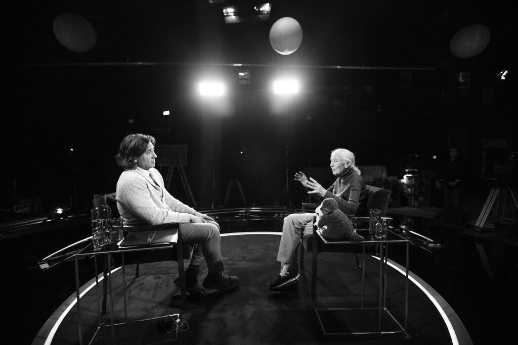 Интервью происходило на пустой сцене студии, где друг против друга сидели только они двое, а съёмки велись без операторов, дистанционно управляемыми камерами. Расслабившись и выпив немного виски, которое, по её словам, было полезно для её голоса, Гудолл, с присущим ей сочетанием спокойствия, упрямства и юмора, для начала дала краткий обзор своей большой жизни и работы.