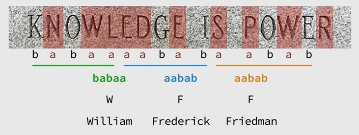О том, как под конец жизни мучила совесть Уильяма Фридмана, никаких документов у историков нет, насколько известно. Но зато достоверно известно, что в качестве своего прощального послания — на камне надгробного памятника — Фридман оставил надпись, дважды отсылающую к Фрэнсису Бэкону и его двухлитерному шифру. На могильном камне криптографа выбито знаменитое изречение Бэкона «KNOWLЕDGE IS POWER» , а в буквы этих слов двухлитерным бэконовским шифром встроены инициалы Фридмана : W-F-F. [20]
